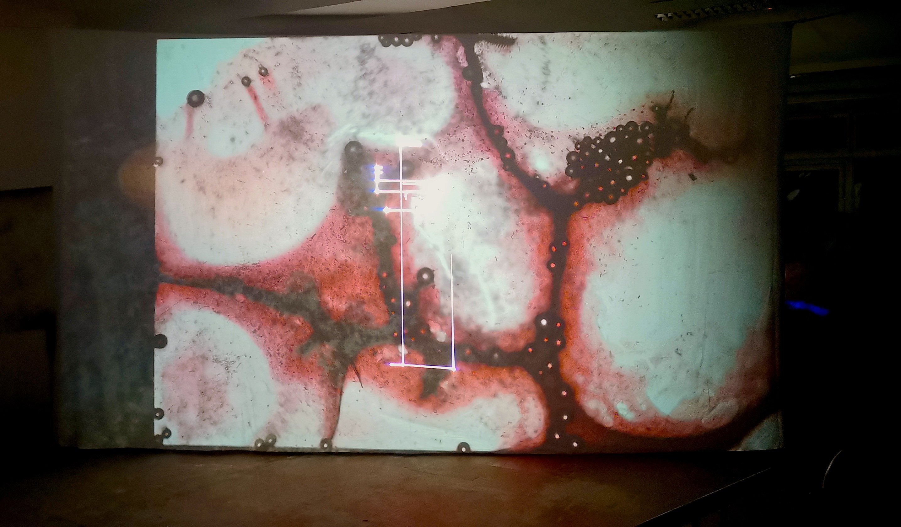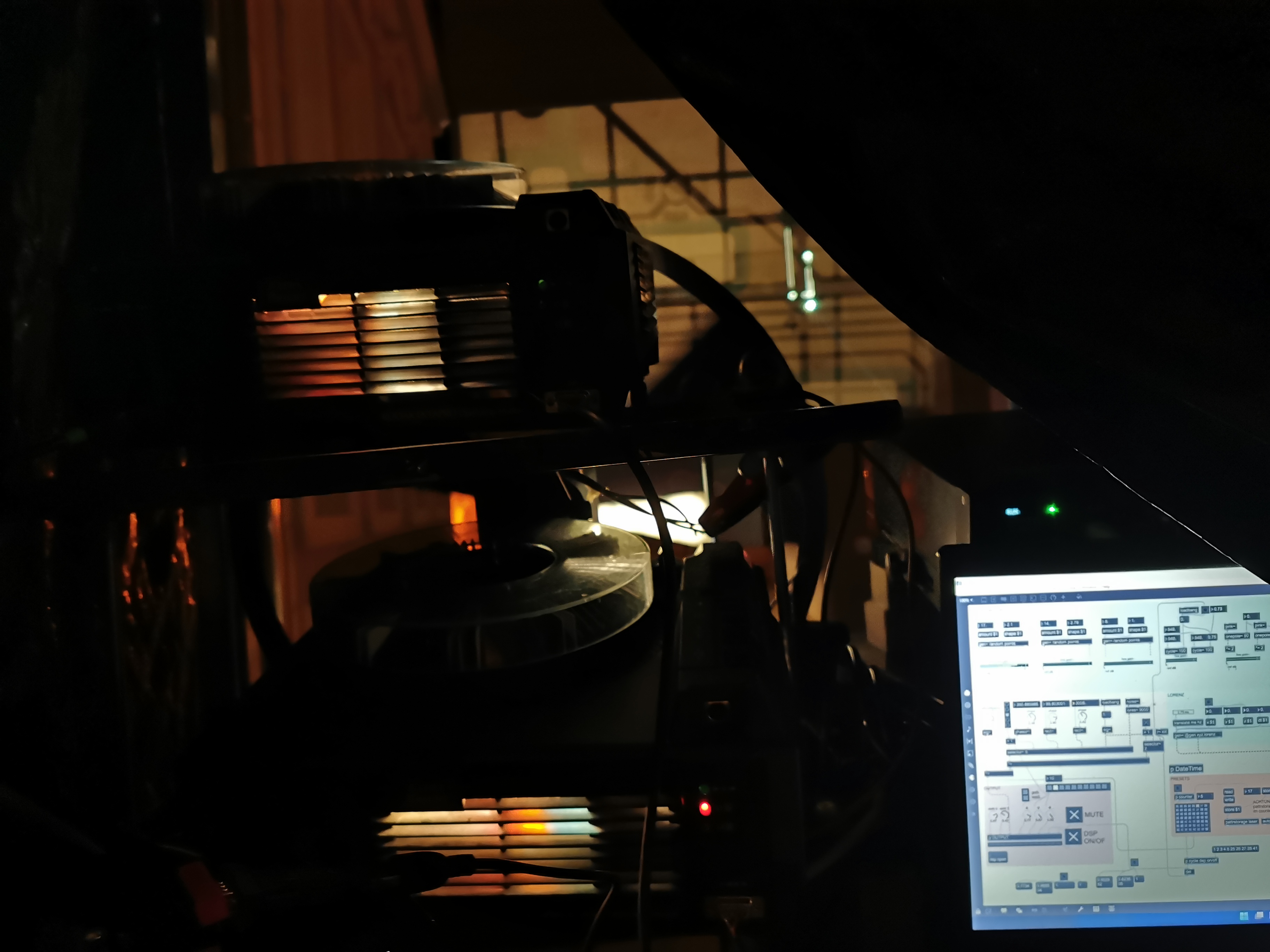 The Installation My Dear Lorenz… combines Laser beams generated by algorithms and animated slide projections. The coded Laser traces are inspired by mathematical functions of lorenz attractors creating evolving graphical patterns. These patterns are merged with abstrakt Dia Positives, transparent circuit inlays of everyday electronics and negative high contrast photography. The dia projector apparatus is modified with shutters and moving defraction lenses blending the images into short animations fusing to an immersive, visual experience.